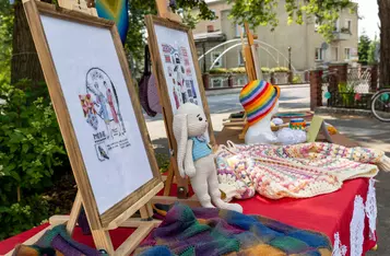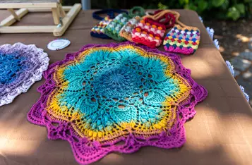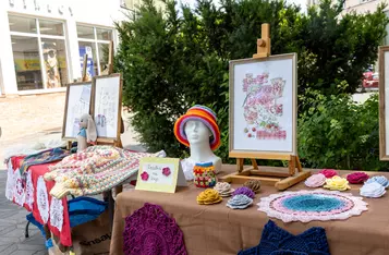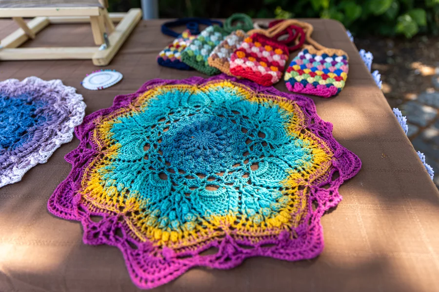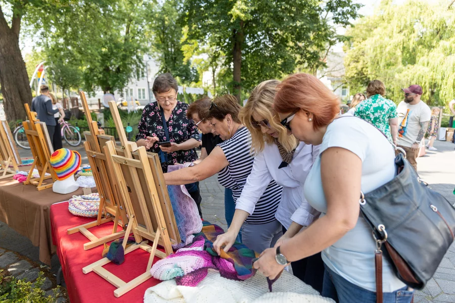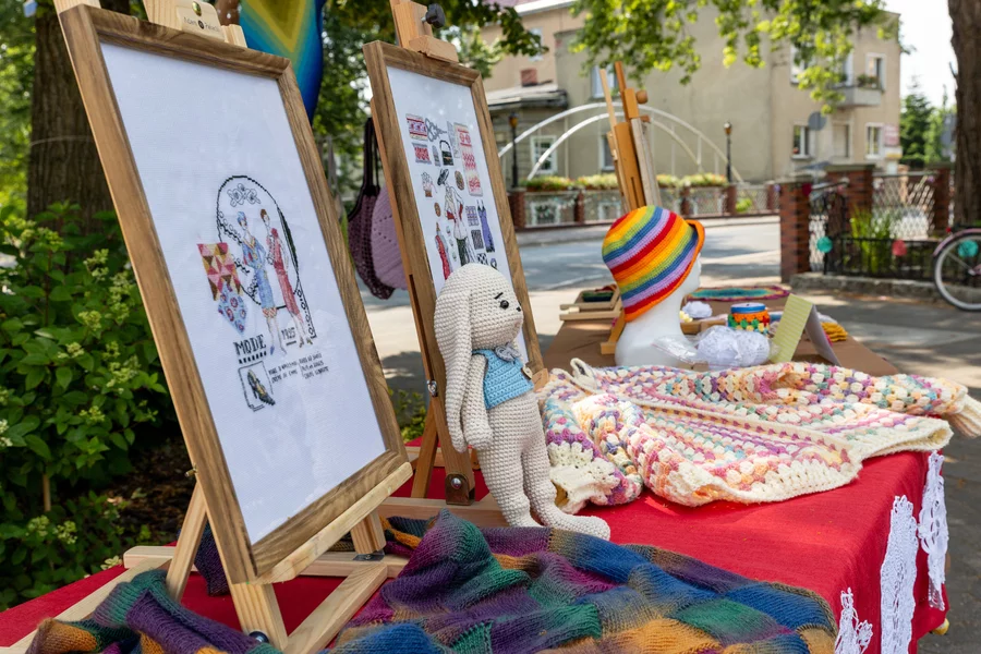 Przed rozpoczęciem wspólnego dziergania przyozdobiono rękodziełem most na Wrocławskiej i rozstawiono stoły na których prezentowano wykonane wcześniej prace.