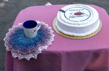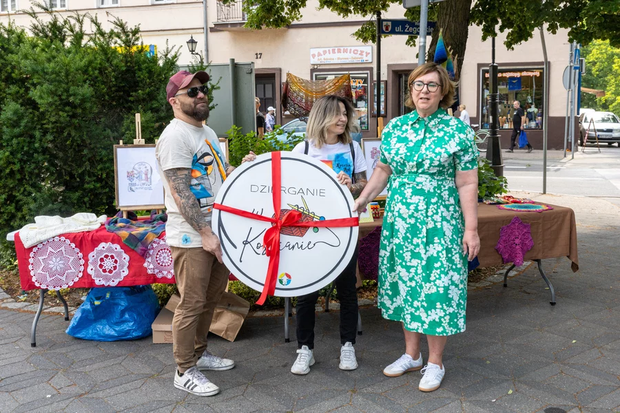 Podczas akcji artyści Ewa i Marcin Michalewiczowie przekazali grupie planszę z logo, która będzie jej towarzyszyć podczas kolejnych spotkań. Z okazji światowego dnia dziergania w miejscach publicznych uczestników poczęstowano tortem i każdej dziergającej osobie podarowano okolicznościowyu kubek.