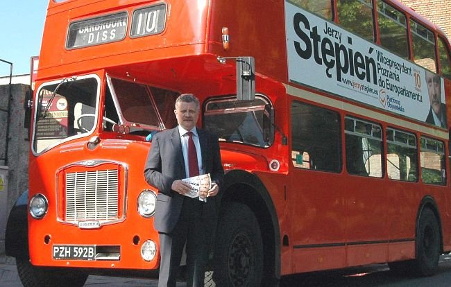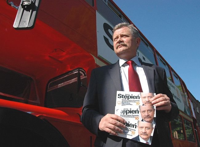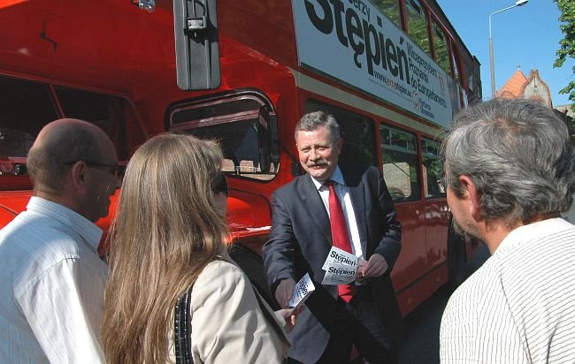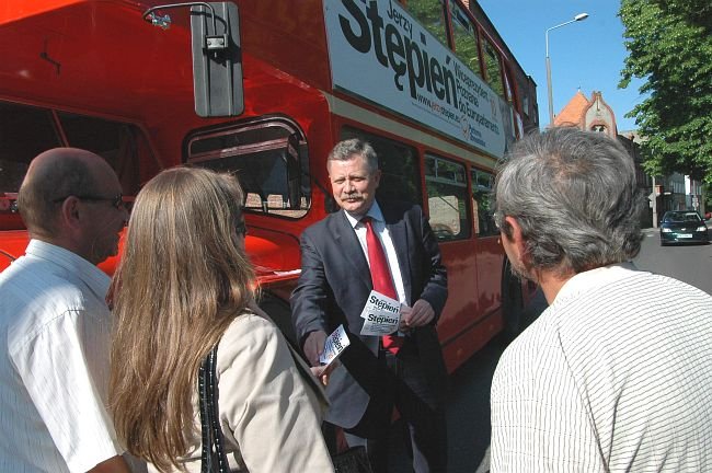 Jerzy Stępień jest drugim - po Marku Siwcu - kandydatem, który prowadził bezpośrednią kampanię w Kościanie. Do miasta przyjechał piętrowym wyborczym autobusem.