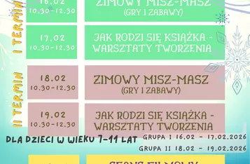 18-19 lutego: – zimowy misz-masz (gry i zabawy) oraz warsztaty tworzenia książki (do złożenia prawdziwe książki!)