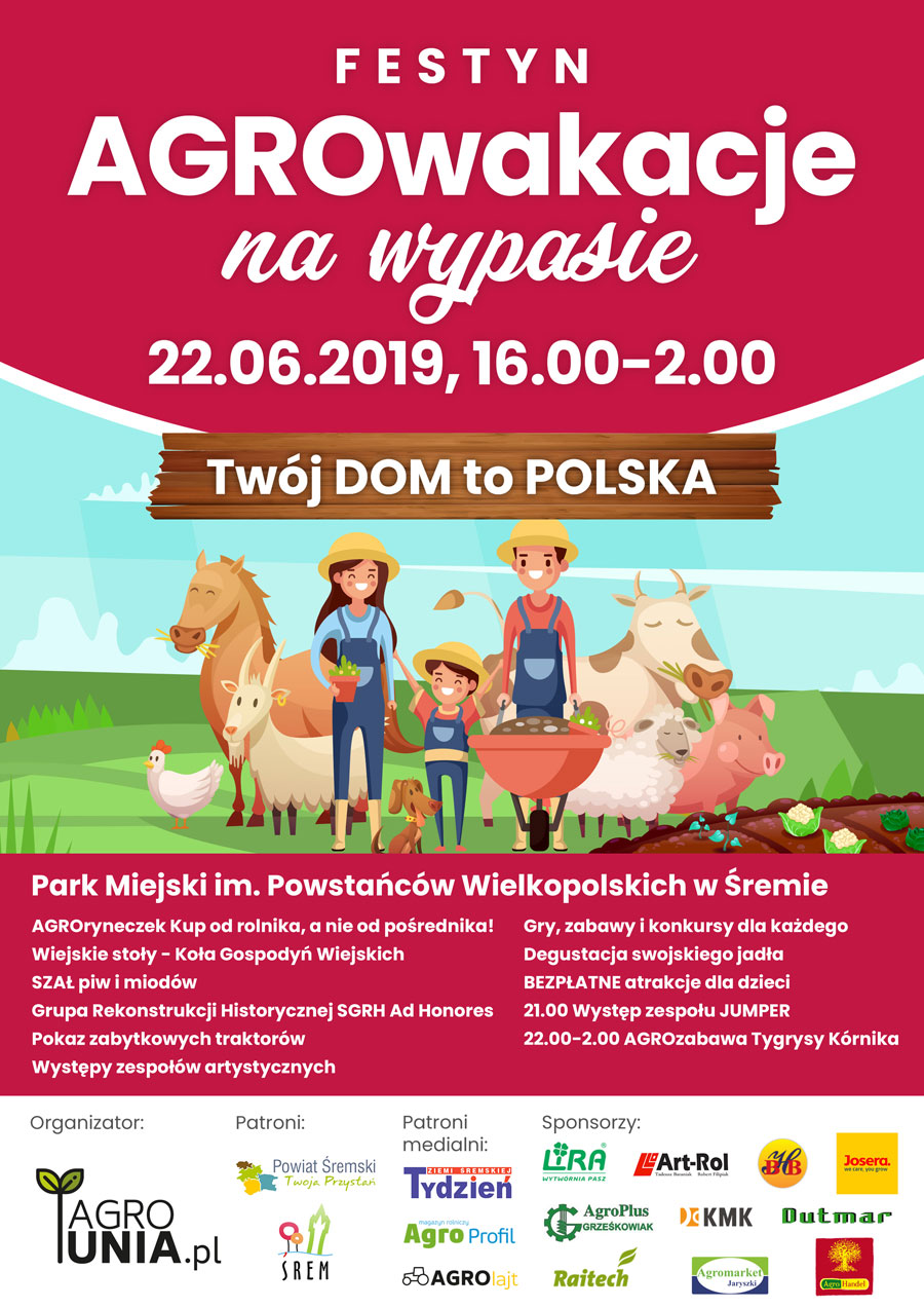 W ramach projektu „Twój Dom to Polska”, 22 czerwca w Parku Miejskim im. Powstańców Wielkopolskich w Śremie, po raz pierwszy odbędzie się rodzinny festyn "AGROwakacje na wypasie".