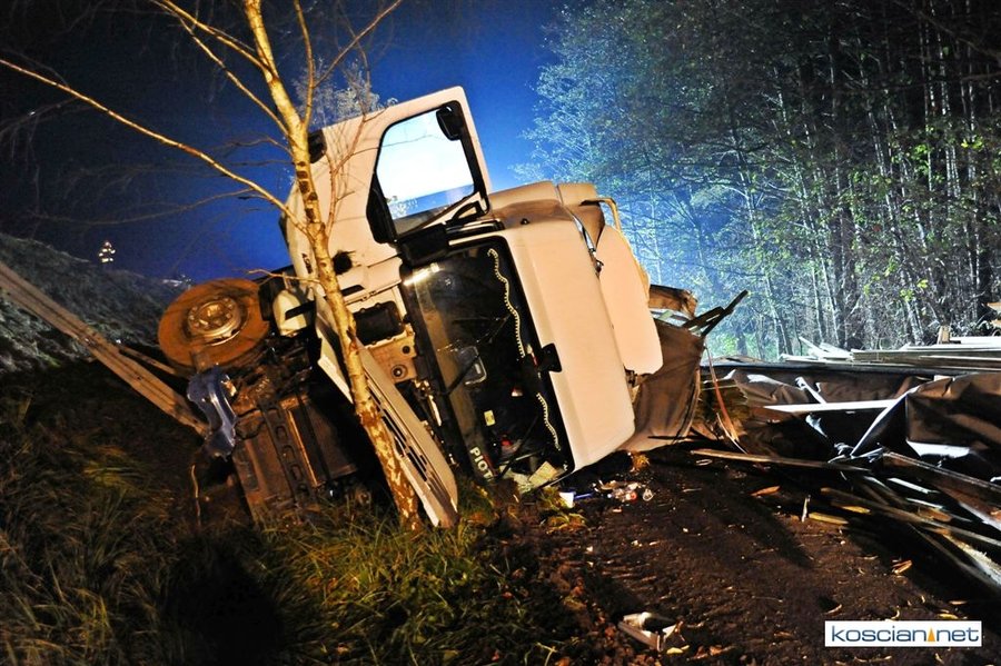 Do wypadku doszło przed godziną 17. Jak wynika ze wstępnych ustaleń jadący w kierunku Kościana mercedes, prowadzony przez 31-letniego mieszkańca powiatu kościańskiego, zjechał na przeciwny pas ruchu i uderzył w koło jadącego w kierunku Leszna samochodu ciężarowego. Załadowana kilkudziesięcioma metrami sześciennymi drewnianych łat ciężarówka uderzyła w bariery energochłonne i stoczyła się ze skarpy.