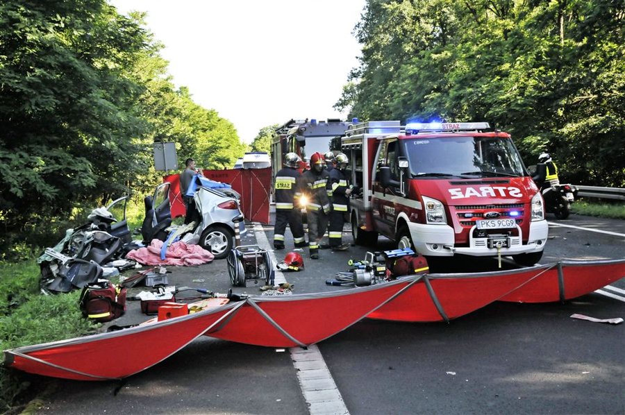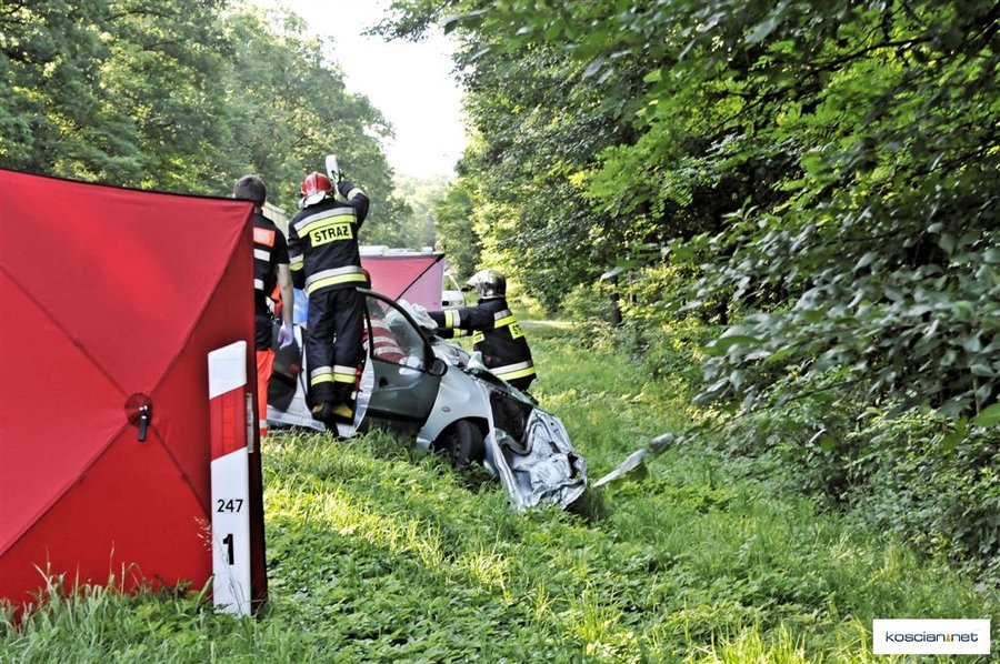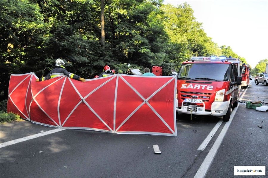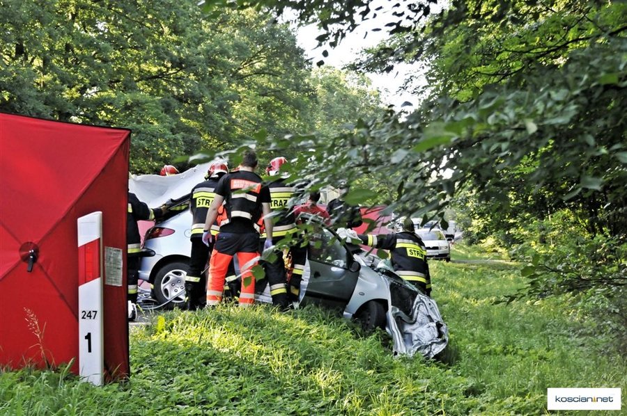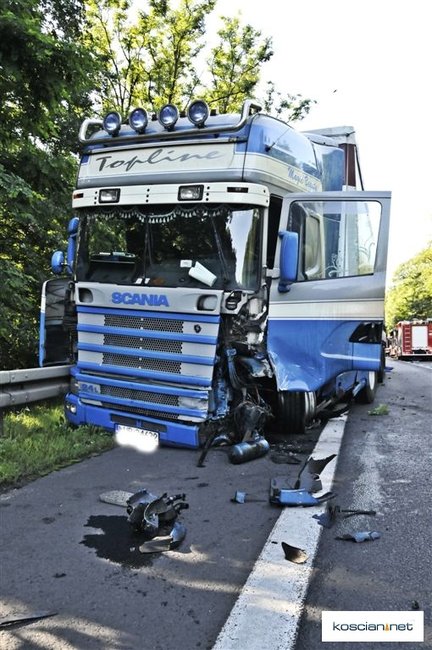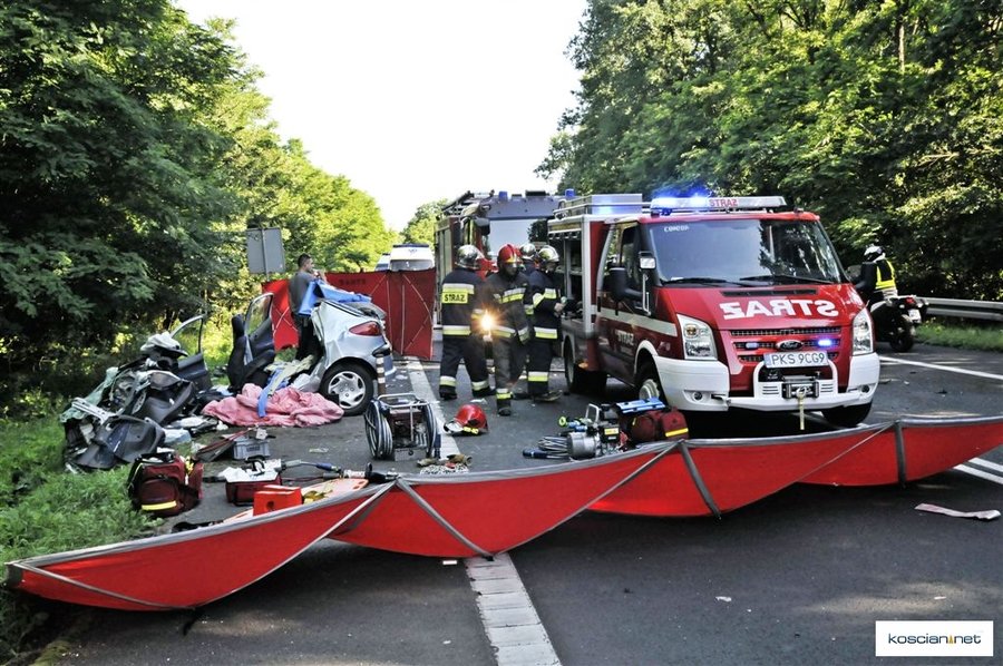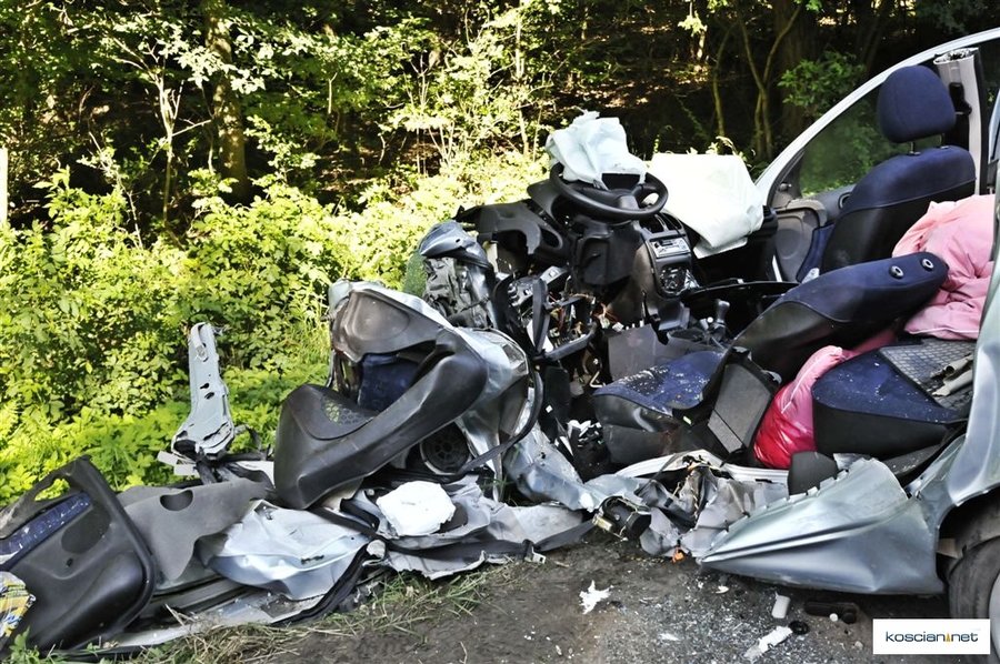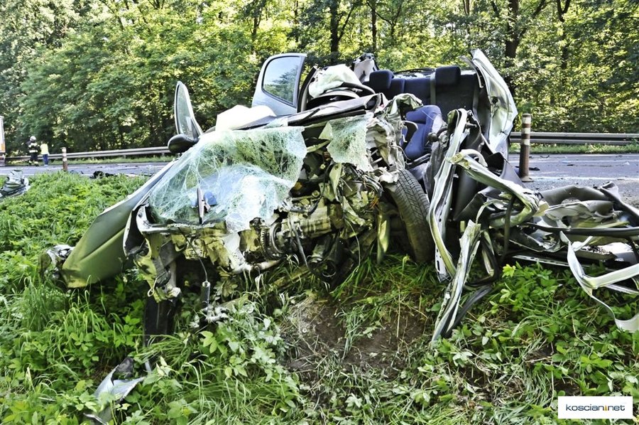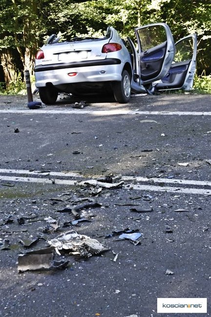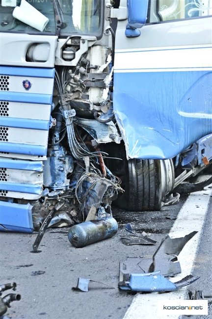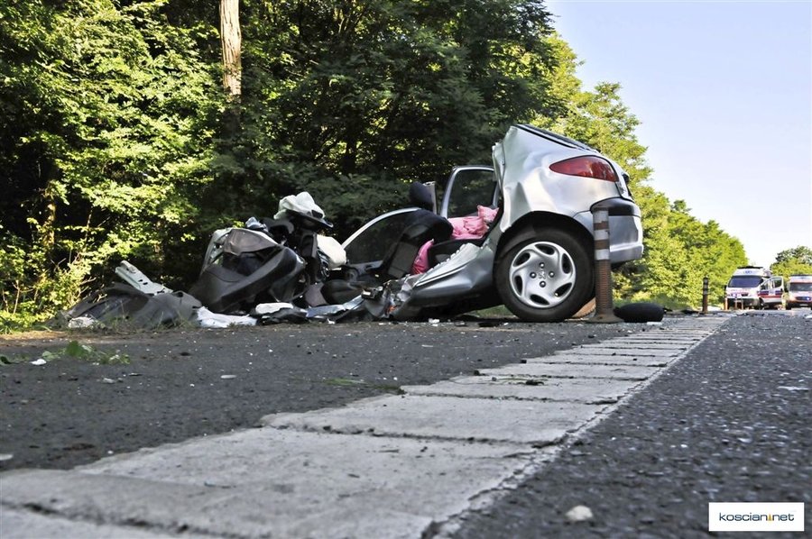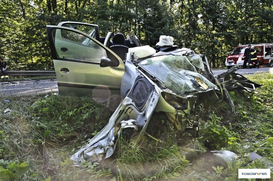 Do wypadku doszło około godziny 7.30. Osobowy peugeot z niewyjaśnionych przyczyn zjechał na przeciwny pas ruchu wprost pod jadącą od strony Leszna ciężarową scanię z naczepą.