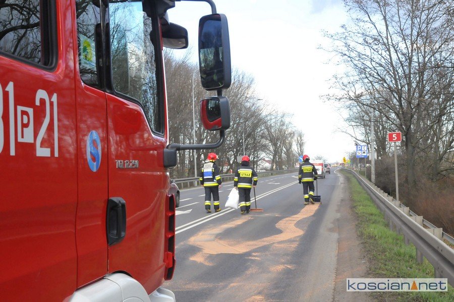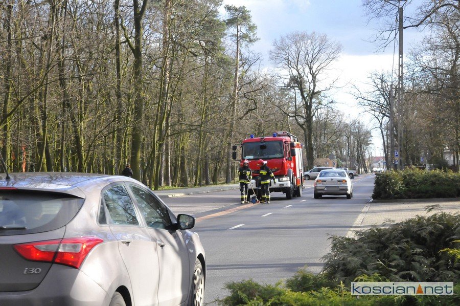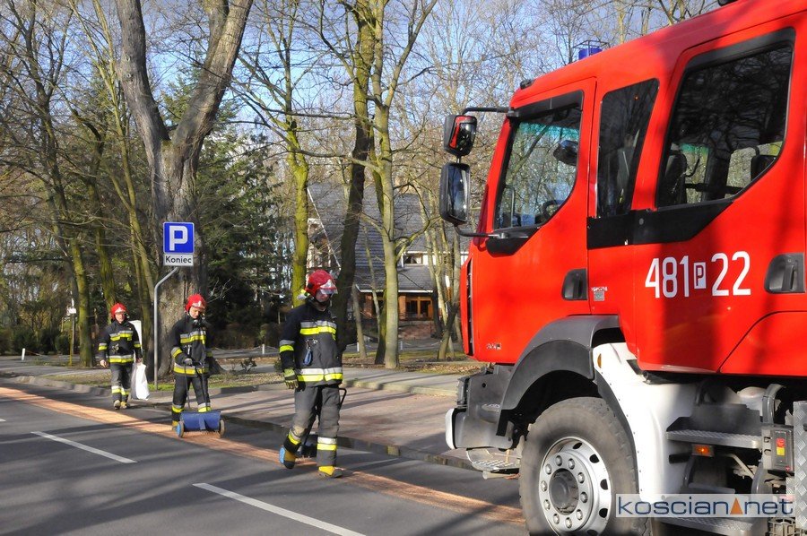 Do zdarzenia doszło w środę, 11 marca w Kościanie. Na al. Koszewskiego z autobusu na leszczyńskich numerach rejestracyjnych zaczął wyciekać olej. Pojazd z usterką przejechał przez Skwer Krimpen i wjechał na obwodnicę Kościana. Niebezpieczny płyn zalegający na jezdni zneutralizowali strażacy.