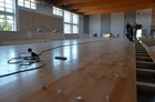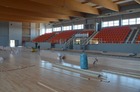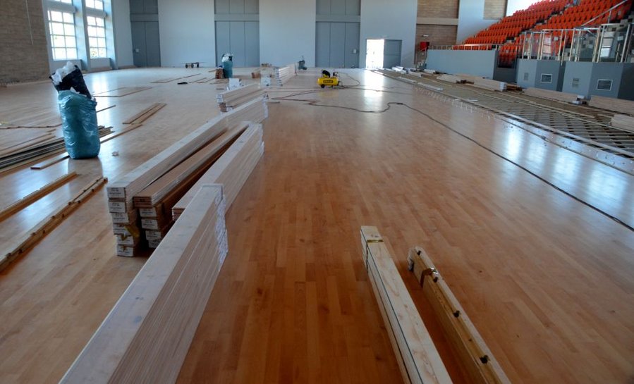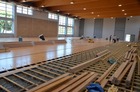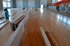 Trwają prace przy układaniu podłogi w hali sportowo-widowiskowej w „Ratajczaku”.