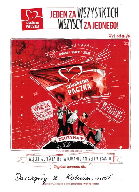 I my dziękujemy wszystkim, którzy pomogli przy kompletowaniu Szlachetnej Paczki. Kłaniamy się: pani Agnieszce z mężem, panu Jakubowi, panu Sebastianowi z żoną, panu Marcinowi, pani Sylwii z Pawłem, Mikołajem i Olgą, pani Joli, pani Monice, Marysi z rodzicami i dziadkami, panu Andrzejowi i Joannie, pani Dorocie, pani Ludmile i Sebastianowi, pani Milenie oraz dwóm paniom Alicjom.
