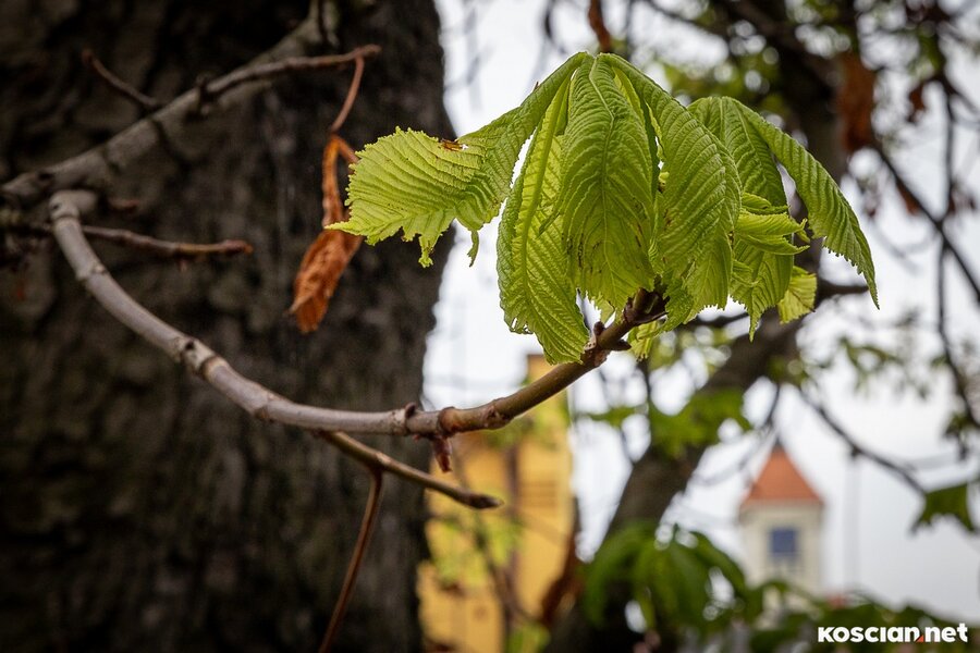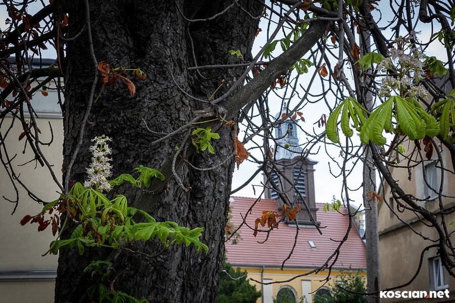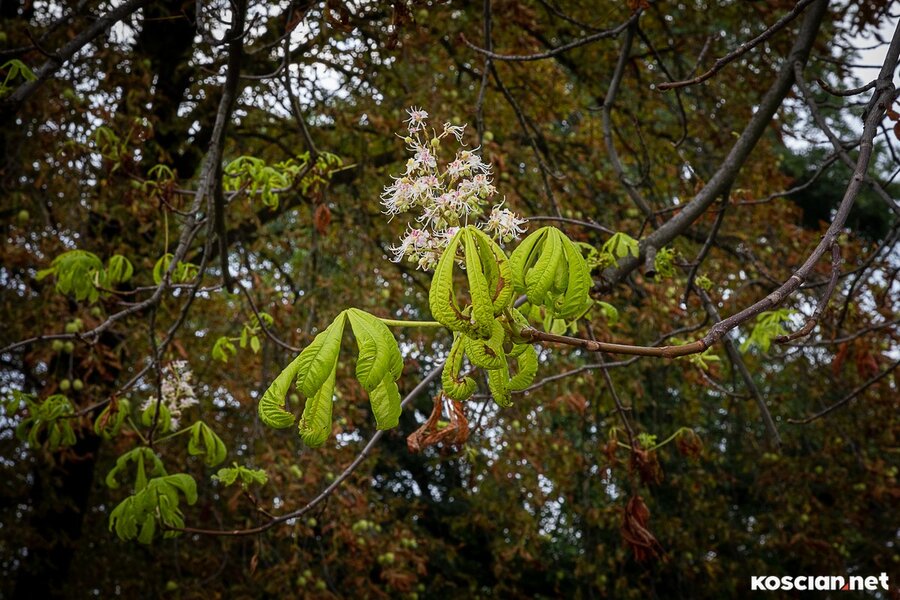 Kasztanowiec rosnący przy ulicy Targowej w Kościanie wypuścił nowe liście i po raz drugi w tym roku zakwitł. Pierwsze kwiaty miał w maju, gdy rozpoczynały się matury. Drugie wypuścił w sierpniu, gdy rozpoczęły się poprawkowe matury. Co ciekawe, obok kwiatów rosną dojrzałe kasztany.