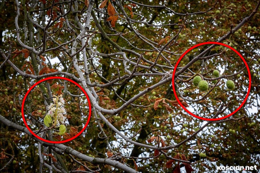 Na rozregulowanie zegara biologicznego drzewa mogła mieć wpływ szrotówka kasztanowcowiaczka, przez którą drzewa zrzucają liście już latem. Brak liści, ciepło i duża ilość światła przypominająca wiosnę sprawia, że kasztany ponownie kwitną. Prawdopodobnie los tego drzewa jest już przesądzony. Z roku na rok będzie coraz słabsze…