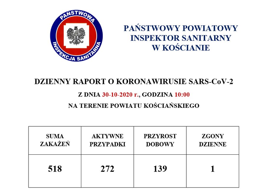 Dzisiejszy raport kościańskiego sanepidu różni się od wcześniejszych. Nie tylko liczbami, ale i układem danych. W nowym raporcie nie ma informacji o liczbie ozdrowieńców i sumie zgonów od początku epidemii. Pojawiła się rubryka „zgony dzienne”, z której wynika że w ostatniej dobie zmarła jedna osoba. Byłyby to drugi przypadek od marca.