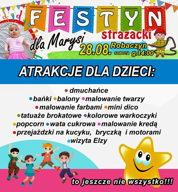 Druhowie z Ochotniczej Straży Pożarnej w Robaczynie wspierani przez liczne Anioły Marysi zorganizowali w sobotę, 28 sierpnia, festyn charytatywny na rzecz Marysi Drożdżyńskiej z Brenna. Okazji do zabawy i finansowego wsparcia Marysi, która potrzebuje 9 milionów złotych na leczenie, nie brakowało. Na uczestników festynu czekały liczne atrakcje. Podczas kilkugodzinnej zabawy zebrano imponującą kwotę 57 231 zł i 15 euro!