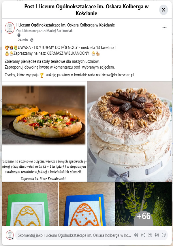 Rada Rodziców Liceum Ogólnokształcącego w Kościanie zorganizowała kiermasz wielkanocny, którego celem jest zebranie środków na stoły tenisowe dla uczniów. Można kupić wypieki, ozdoby świateczne a także wymianę oleju w samochodzie, vouchery na siłownię, do kosmetyczki itp