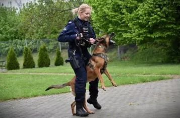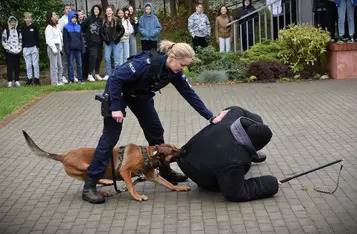 Drugą część spotkania poprowadzili policyjni przewodnicy psów służbowych, którzy ze swoimi czworonogami pomagają w wykrywaniu śladów na miejscu zdarzenia, ujawnianiu narkotyków, materiałów niebezpiecznych czy tropieniu.