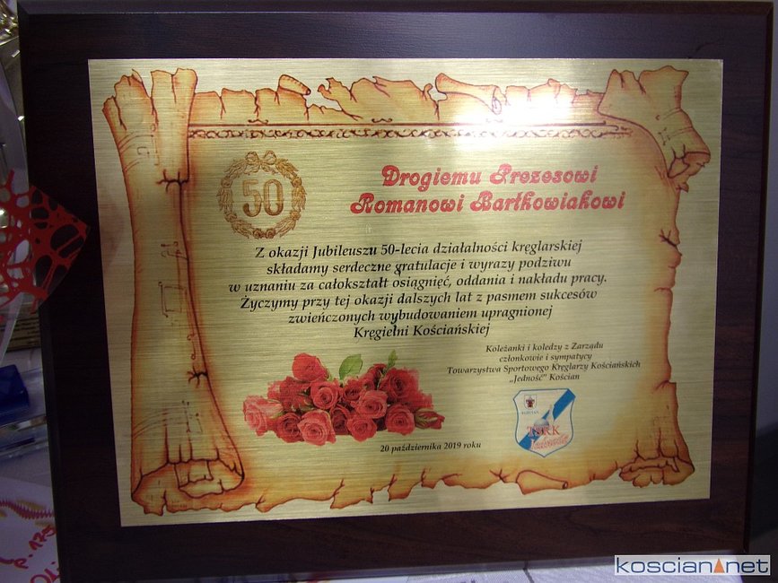 Podczas VIII Turnieju Miast w Kręglarstwie Klasycznym o Puchar Prezesa TSKK Jedność Kościan świętowano jubileusz 50-lecia działalności kręglarskiej Romana Bartkowiaka.