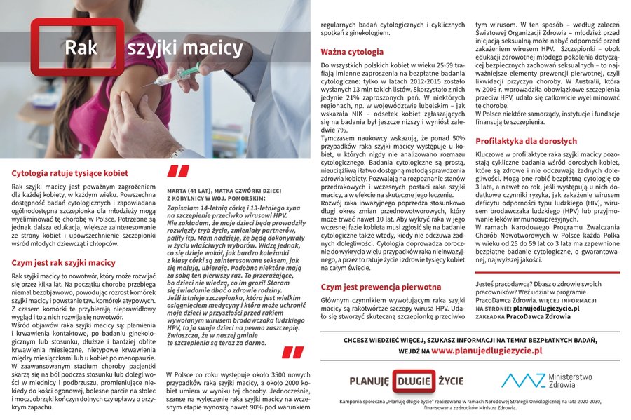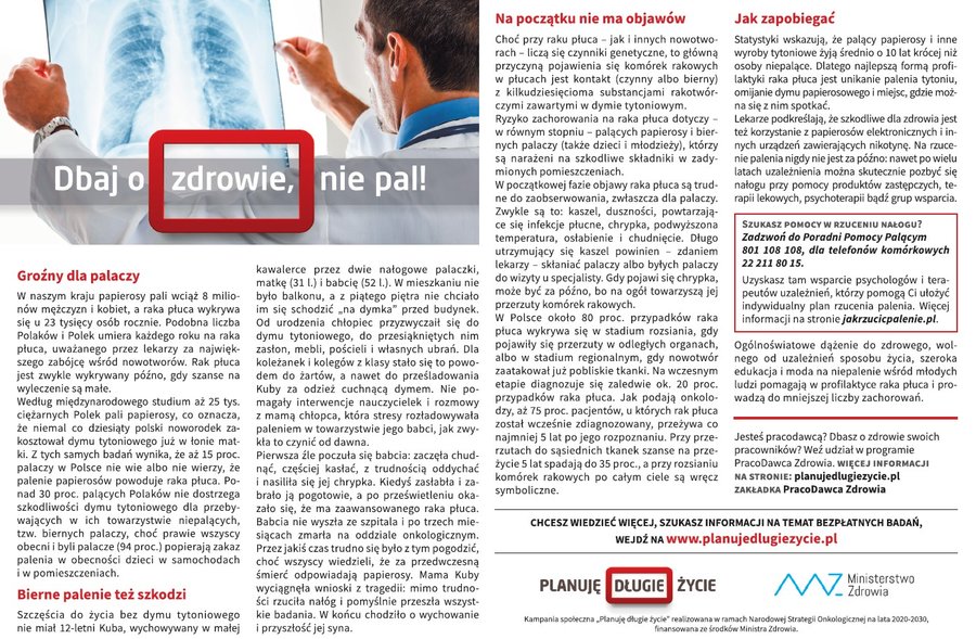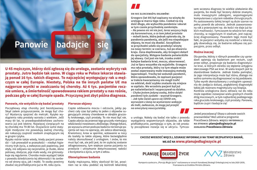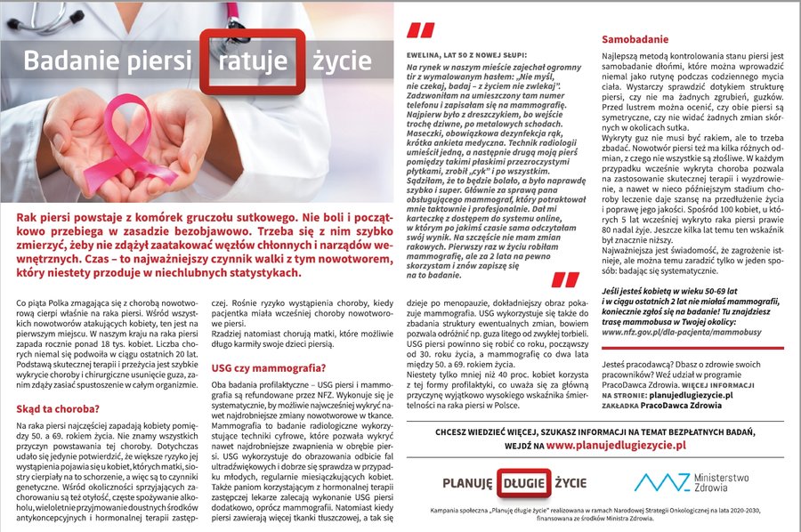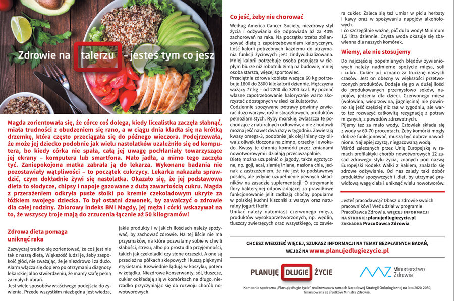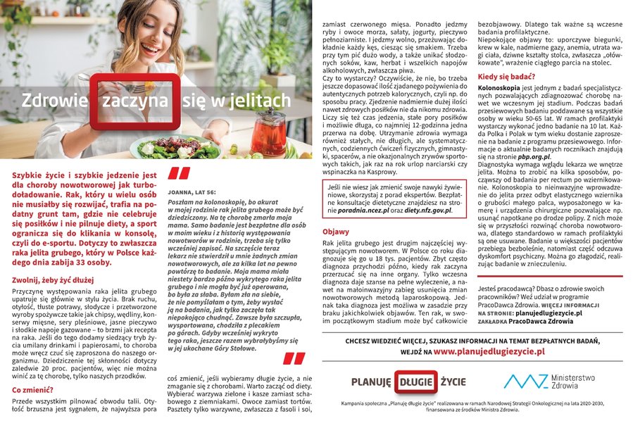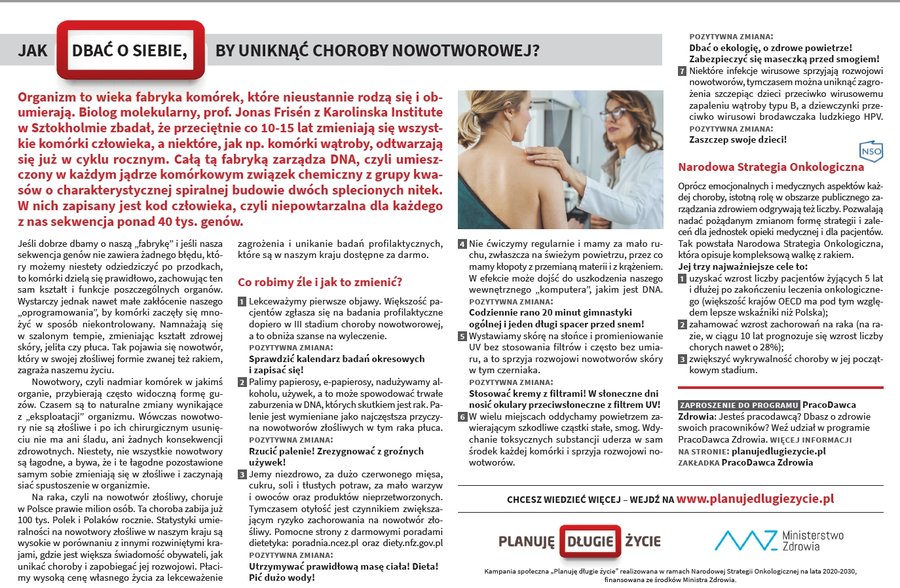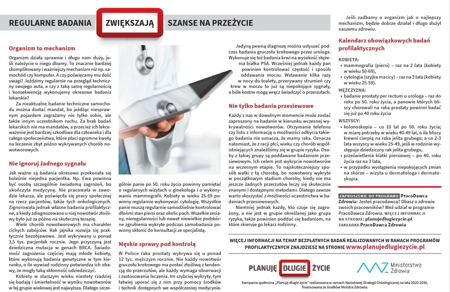 Planuję długie życie - to hasło przewodnie kampanii informacyjno-edukacyjno-promocyjnej ministerstwa. Jej cel to poprawa stanu wiedzy społeczeństwa na temat postaw prozdrowotnych, przeciwdziałania i zapobiegania zachorowaniu na nowotwory, a także zwiększenie zgłaszalności na badania profilaktyczne pod kątem nowotworowym. Celem kampanii jest także promocja zdrowego trybu życia, zwłaszcza zdrowego odżywiania jak i uprawiania dbania o kondycję ruchową. Więcej informacji znajduje się na stronie głównej kampanii.