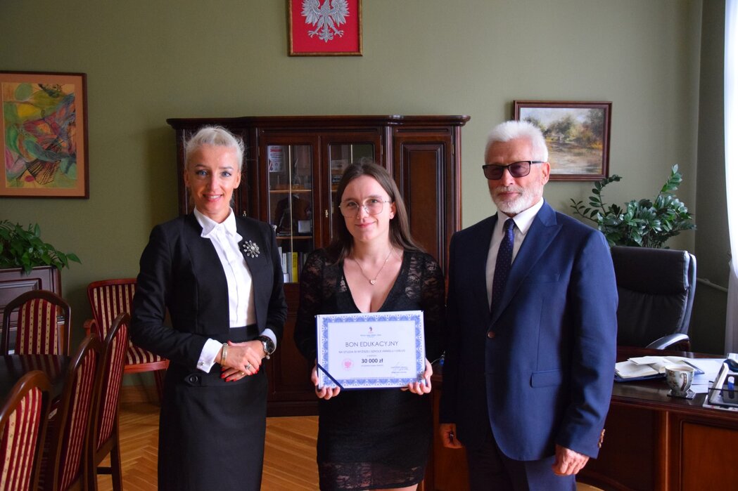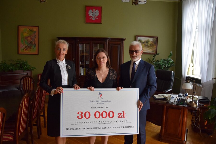 Anna Belka, absolwentka II Liceum Ogólnokształcącego w Zespole Szkół Ponadpodstawowych im. Franciszka Ratajczaka w Kościanie otrzymała czek w wysokości 30 tys. złotych zapewniający pokrycie kosztów studiów licencjackich na Wyższej Szkole Handlu i Usług w Poznaniu. Czek przekazała Magdalena Górska, założycielka i prezes Wyższej Szkoły Handlu i Usług w Poznaniu w towarzystwie starosty Henryka Bartoszewskiego. Spotkanie odbyło się 14 września w Starostwie Powiatowym w Kościanie.