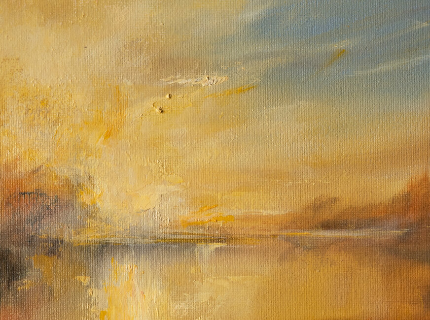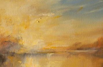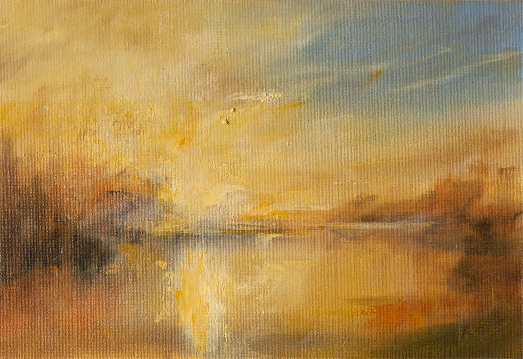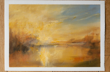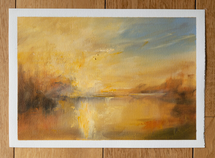 Przedmiotem aukcji na Allegro Lokalnie jest pejzaż - wschód słońca. To obraz olejny na płótnie o wymiarach 30x21 cm. Obszar zamalowany to około 27x18 cm.