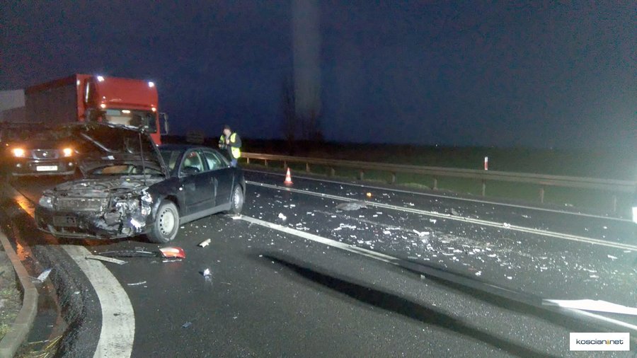 - Jadący w kierunku Poznania ciągnik siodłowy marki Daf, kierowany przez 32-letniego mieszkańca powiatu czarnkowskiego, najechał na tył samochodu audi skręcającego w lewo do stacji paliw. Następnie daf przemieścił się na przeciwległy pas ruchu i zderzył się z jadącym z przeciwnego kierunku samochodem ciężarowym marki MAN kierowanym przez 68-letniego mieszkańca powiatu ząbkowickiego – informuje Artur Ustasiak, oficer prasowy KPP w Kościanie.
