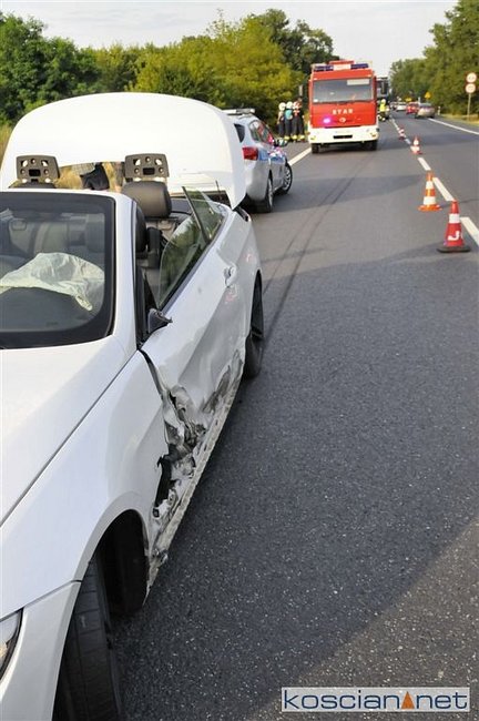 Do kolizji doszło w sobotę, 20 lipca, około godziny 18.30, na obwodnicy Kościana pomiędzy rondem w Kiełczewie a Sierakowem. Jak wynika ze wstępnych ustaleń, kierujący oplem 30-latek z powiatu kościańskiego zjechał na przeciwny pas ruchu i zderzył się z bmw prowadzonym przez 28-latka z powiatu krotoszyńskiego. Jednego z uczestników kolizji przewieziono do szpitala na badania.