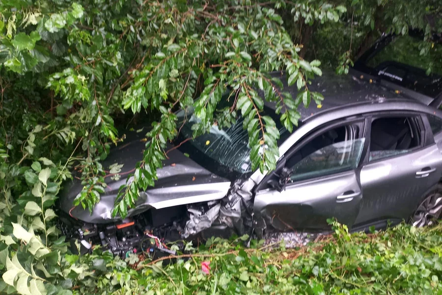 Siła uderzenia była na tyle duża, że renault wypadł z jezdni i zatrzymał się w przydrożnym rowie. Na miejsce skierowano służby ratunkowe – policję, straż pożarną z jednostki zawodowej oraz ochotników.