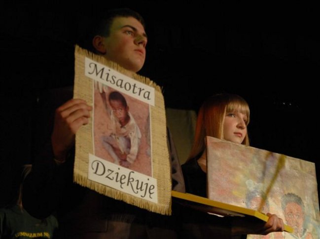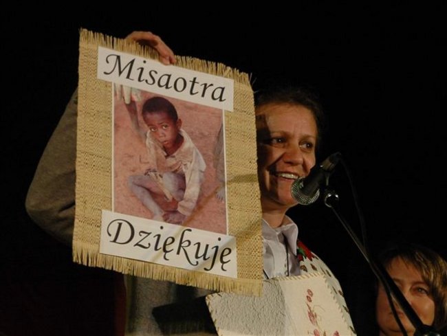 - Jestem tu w imieniu tych wszystkich, którym dotąd pomogliście. W kulturze malgaskiej przemówienia zajmują bardzo ważne miejsce, są one częścią wszystkich spotkań. Dobry mówca na Madagaskarze to ten, który mówi długo i potrafi posługiwać się przysłowiami. Dziś odstąpię od tej tradycji, by dać czas artystom, którzy przez swój występ wypowiedzą nasze misaotra, czyli dziękuję. W kulturze plemienia, wśród którego mieszkam, mówca zdejmuje czapkę przed publicznością – powiedziała siostra Władysława, wygłaszając pozdrowienie w języku malgaskim. – Dziękuję Bogu, dziękuję wam wszystkim i każdemu z osobna, za przyjęcie zaproszenia na dzisiejsze spotkanie, za ofiarowanie swojego czasu i tym samym wyrażenie solidarności z Madagaskarem, za wspieranie naszej misji. Bóg zapłać za każdy ofiarowany talerz ryżu, kubek mleka, zeszyt, ołówek, długopis, list, kolorową kartkę, zabawki. Życie tamtejszej ludności nie jest łatwe, ale wasze wsparcie tzw. misjonarzy na zapleczu, dodaje odwagi i nadziei na lepsze jutro. Zespół Szkół nr 3 ma wkład w rozwój i postęp naszej misji w Fianarantsoa, dzięki wam wiele dzieci mogło skończyć szkołę, dostać przybory szkolne, ubrania i - co istotne – posiłek w stołówce – podkreśliła, dziękując poprzedniej dyrektor ,,trójki’’ Elwirze Pawełkiewicz, nauczycielom, rodzicom i uczniom. Na ręce dyrektor Izabeli Korzeniowskiej przekazała dary od uczniów z Madagaskaru. – Liczymy na waszą dalszą współpracę i życzliwość.
