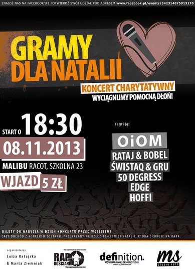 OiOM Chcecie pomóc 12-letniej Natalii Kolasińskiej, uczennicy Szkoły Podstawowej w Racocie chorej na nowotwór? Przyjdźcie w najbliższy piątek - 8 listopada - na koncert charytatywny do Malibu w Racocie, przy ul. Szkolnej 23. Wjazd – 5 złotych.