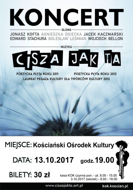 13 października w Kościańskim Ośrodku Kultury wystąpi zespół Cisza Jak Ta. To grupa młodych kontynuatorów folk-poetyckiego nurtu Krainy Łagodności i laureat ,,Pegaza Kultury’’ z 2013 r.