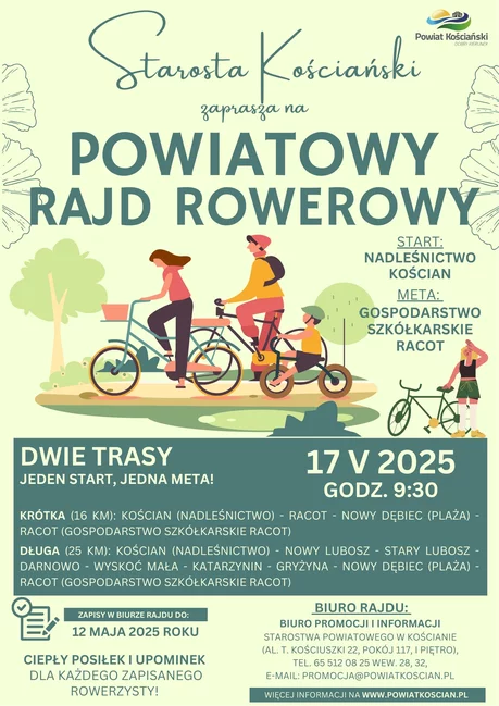 Z kolei Starosta Kościański zaprasza na Powiatowy Rajd Rowerowy, który odbędzie się w sobotę, 17 maja 2025 roku.
