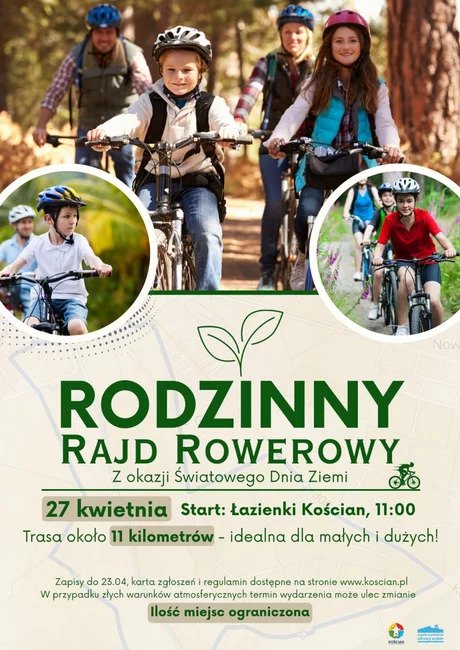 Urząd Miejski Kościana zaprasza do udziału w Rodzinnym Rajdzie Rowerowym, organizowanym z okazji Światowego Dnia Ziemi. Wydarzenie odbędzie się w niedzielę, 27 kwietnia 2024 r.