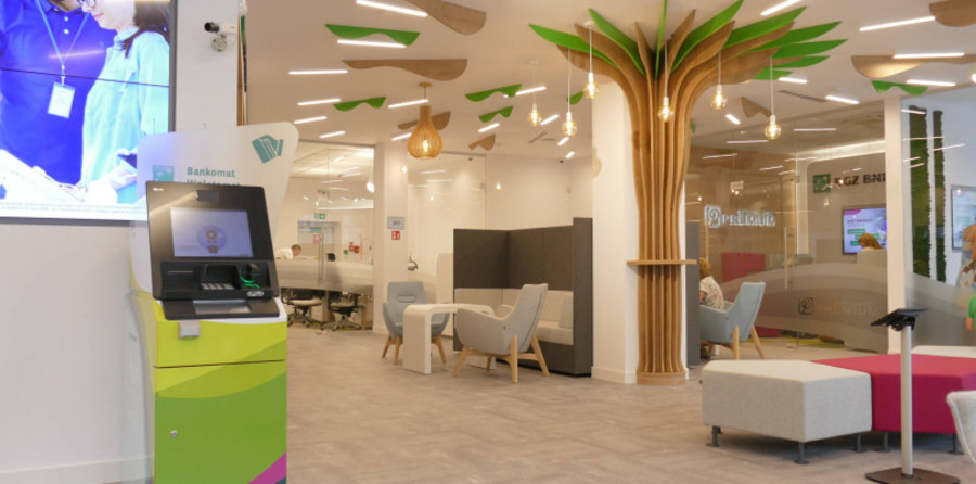 Klienci przyzwyczajeni do bankowych okienek, czy biurowego wystroju zaskoczeni zostaną również dźwiękami śpiewu ptaków…