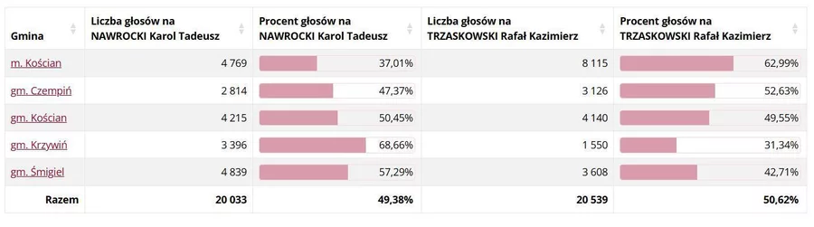 Trzaskowski wygrał w Kościanie i gminie Czempiń. W Śmiglu, Krzywiniu i gminie Kościan wygrał Karol Nawrocki.
