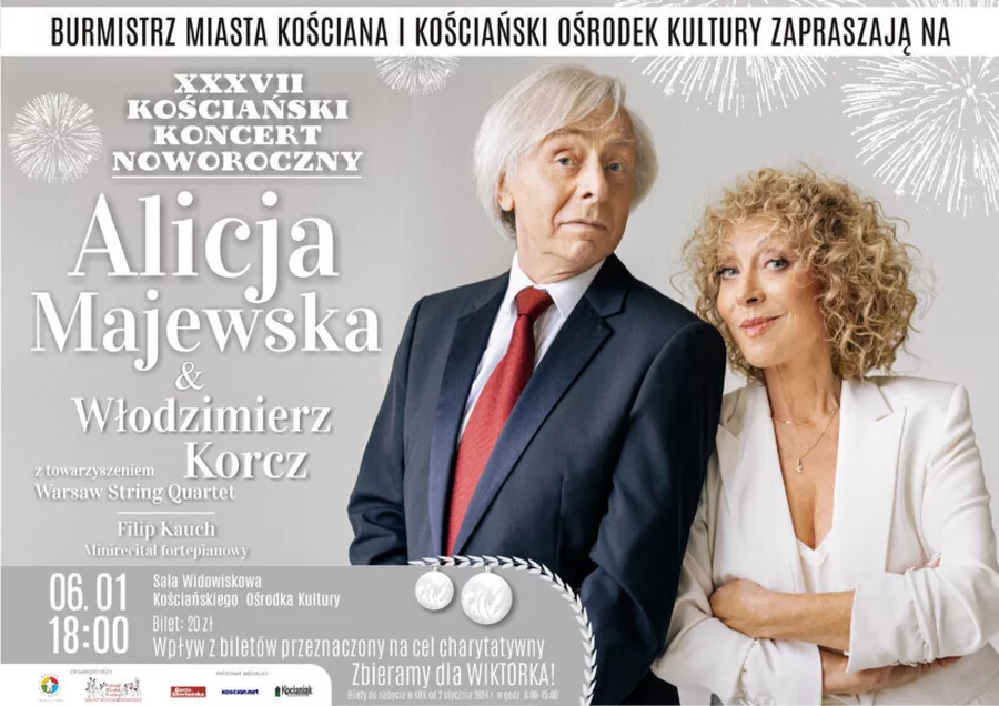 Wystąpi dla Państwa niekwestionowana gwiazda polskiej sceny muzycznej Alicja Majewska oraz pianista i kompozytor Włodzimierz Korcz. Koncert rozpocznie minirecital Filipa Kaucha, genialnie uzdolnionego, młodego pianisty z Kościana. Serdecznie zapraszam na ten niezwykły koncert, z którego dochód zostanie w całości przeznaczony na cel charytatywny mówi Piotr Ruszkiewicz, burmistrz Kościana.