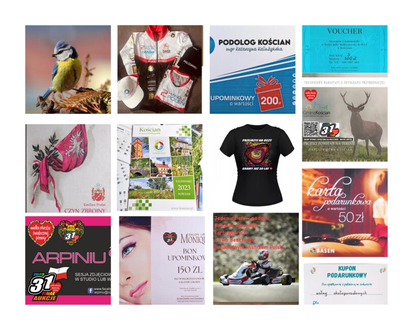 Do wylicytowania między innymi: gadżety i odzież WOŚP, vochery na sesję zdjęciową w ARPINIU, zdjęcia autorstwa Jacka Olejniczaka, trzydniowe warsztaty z fotografii przyrodniczej, voucher na 1 dzień zawodów kartingowych w padoku z Iwo Beszterdą, bony upominkowe od podologa, kupon podarunkowy na spotkanie z położną w zakresie usług okołoporodowych, voucher na zajęcia z matematyki, książki Emiliana Prałata, bon upominkowy do salonu urody, karty podarunkowe na masaże i zabiegi, zestawy gadżetów miasta Kościana…