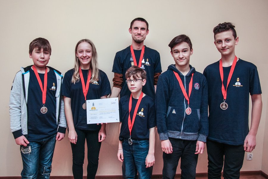 Zdobywcy nagrody Ranatra Fusca: Mikołaj, Asia, Olaf, Wiktor, Bartek. Z tyłu trener Odeseuszy Artur Molendowski.
