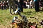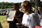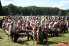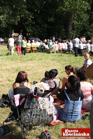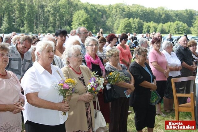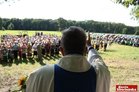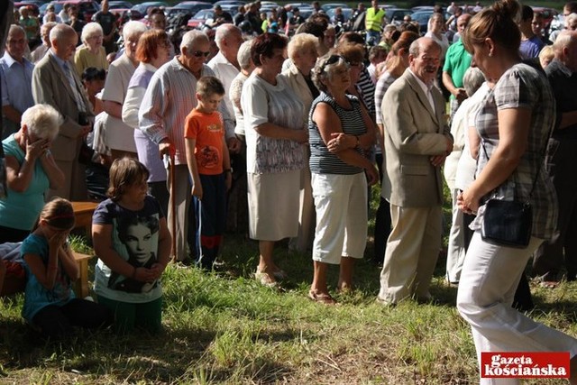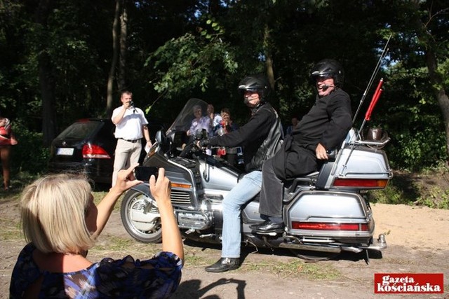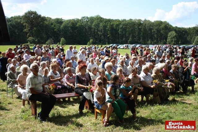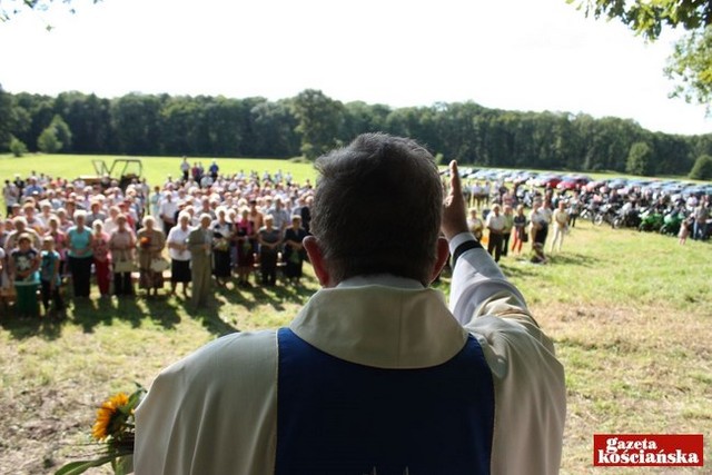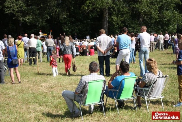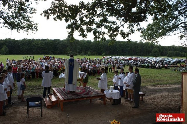 Słońce świeci coraz mocniej. Jest 14.48. Ludzi ciągle przybywa. Są z Kokorzyna, z Sepienka, Szczodrowa, Sierakowa, Kiełczewa, Kościana... Na parkingu stoi już około stu aut. Rowery opierają się o przydrożne topole. Śpiewają ptaki, tną komary a dokładnie o 15.00 leśną ciszę przeszywa ryk trzydziestu ciężkich motorów. To motocykliści z Motoklubu Sokół w Bukówcu Górnym i Żurawie z Kościana. Ryk milknie, gdy maszyny stają na łące, a z jednej z największych zeskakuje proboszcz parafii w Konojedzie - ks. Stanisław Walenszczak.