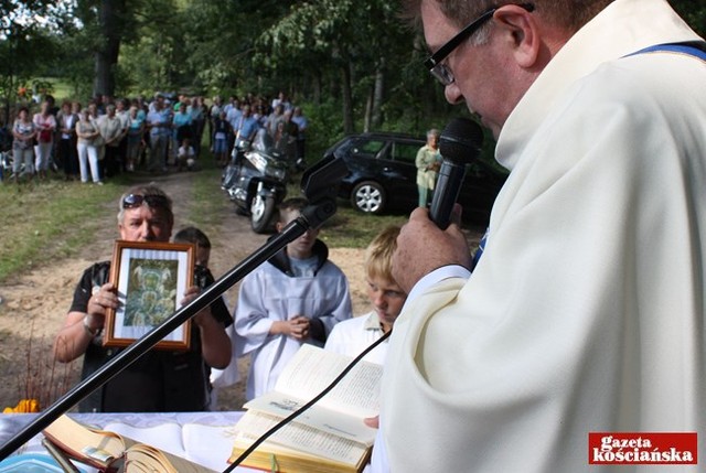 - Ta msza to pomysł, który narodził się podczas kolędy – wyjaśnia Agnieszka Spyrka z Sepna, jedna z organizatorek święta w lesie. - Wuj Jurek Jóźwiak wtedy zaproponował a proboszcz był na tak. Wiosną spotkaliśmy się: I co, robimy? Jasne, że robimy! Potem wybraliśmy dzisiejszą datę - piętnasty sierpnia, w Matki Boskiej Zielnej i proszę sobie wyobrazić, podczas oględzin obrazka – z lupą - znaleźliśmy na nim pieczątkę i datę – piętnasty sierpnia tysiąc dziewięćset trzydziestego dziewiątego roku. To data wydania obrazka. I tu kolejna ciekawostka – przez Warszawską Kurię Metropolitarną. Skąd tu obrazek z Warszawy, nie wiemy. Wiadomo tylko, że to nie jest pierwszy obrazek w tym miejscu.