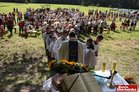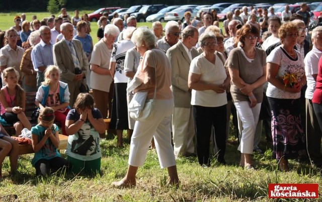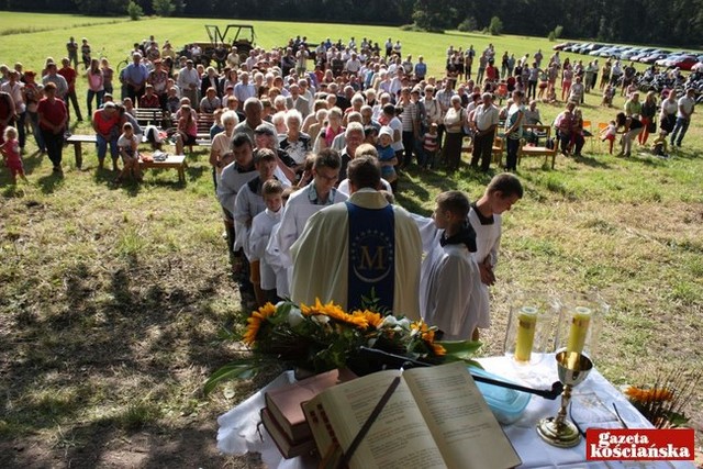 Mszę zaplanowano na piętnastą, ale mieszkańcy Sepna kręcili się tam od samego rana. Pracy było sporo. Dwa kilometry od wsi, w głąb lasu wożono ławki, polowy ołtarz, rozstawiano słupki, rozwijano taśmy. O czternastej wszystko było dopięte na ostatni guzik. Droga zamknięta, parkingowi kierowali pojazdy na dwa odgrodzone postoje - dla aut i osobny dla motocyklistów, gotowy ołtarz w słonecznikach na środku zamkniętej drogi, a w ławkach już spora grupa wiernych z bukiecikami.