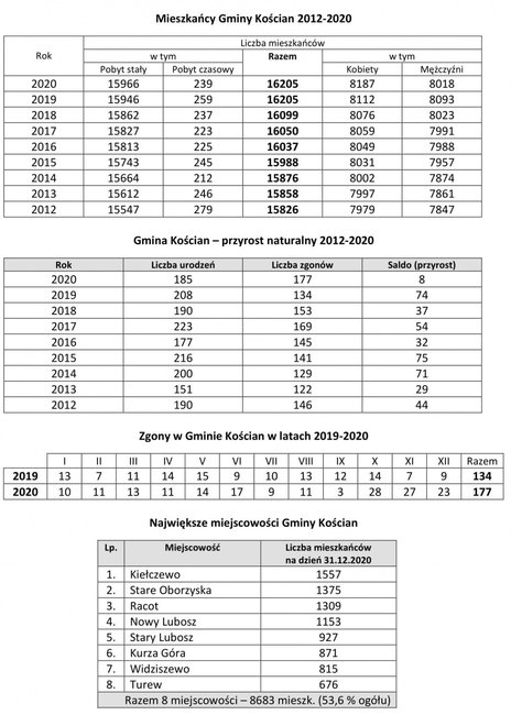 Przyrost naturalny w Gminie Kościan w roku 2020 był dodatni, ale liczba urodzeń – 185 (75 dziewczynek i 110 chłopców), tylko nieznacznie przewyższyła liczbę zgonów – 177. Prawie połowa zgonów miała miejsce w ostatnich trzech miesiącach ubiegłego roku. Więcej zmarło mężczyzn – 96, niż kobiet – 81.