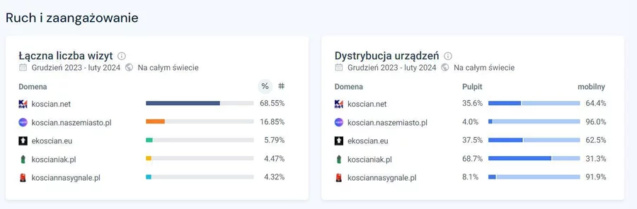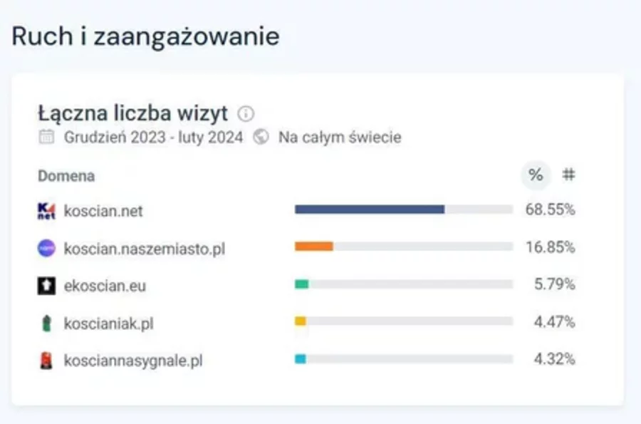 Oto szacunkowy podział ruchu w 5 lokalnych serwisach poświęconych ziemi kościańskiej w okresie od grudnia 2023 do lutego 2024. Zestawienie powstało za pomocą niezależnego narzędzia analitycznego: similarweb.com i można je zweryfikować samodzielnie wykorzystując 7 dniowy darmowy dostęp po rejestracji na stronie.