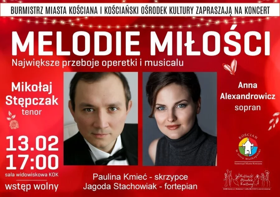 Kościański Ośrodek Kultury zaprasza na koncert Anny Alexandrowicz i Mikołaja Stępczaka, podczas którego wykonają największe przeboje operetki i musicalu. Wstęp wolny.