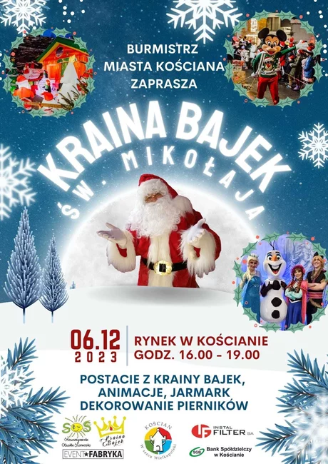W mikołajki, czyli w środę, 6 grudnia, na kościański Rynek przybędzie Święty Mikołaj ze świtą z Krainy Bajek. W programie między innymi: spotkanie ze Świętym Mikołajem, postaci z Krainy Bajek, animacje dla dzieci, dekorowanie pierników i rozświetlenie miejskiej choinki. Nie zabraknie jarmarkowych stoisk oraz gastronomi z grzańcem.