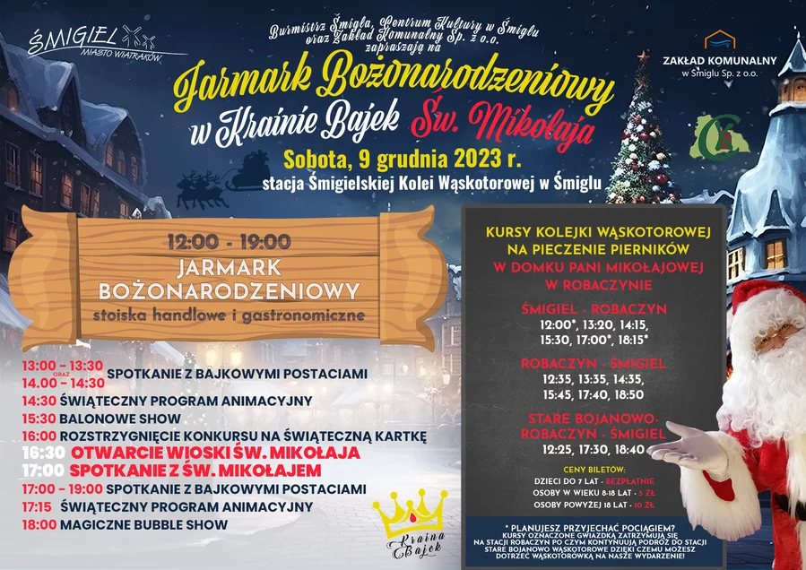 Jarmark odbędzie się w sobotę, 9 grudnia, na stacji Śmigielskiej Kolei Wąskotorowej. Organizatorzy zapowiadają świąteczne animacje, spotkanie z bajkowymi postaciami oraz balonowe i magiczne bubble show. Ponadto kolejką będzie można dojechać do stacji w Robaczynie, gdzie stacjonować będzie Pani Mikołajowa, z którą będzie można wypiekać i dekorować pierniki.