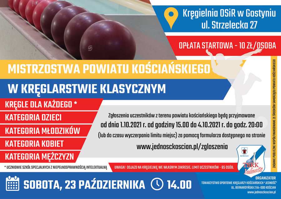 23 października na kręgielni OSiR w Gostyniu (ul. Strzelecka 27) rozegrane zostaną Mistrzostwa Powiatu Kościańskiego w Kręglarstwie Klasycznym, których organizatorem jest Towarzystwo Sportowe Kręglarzy Kościańskich „Jedność".