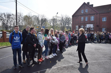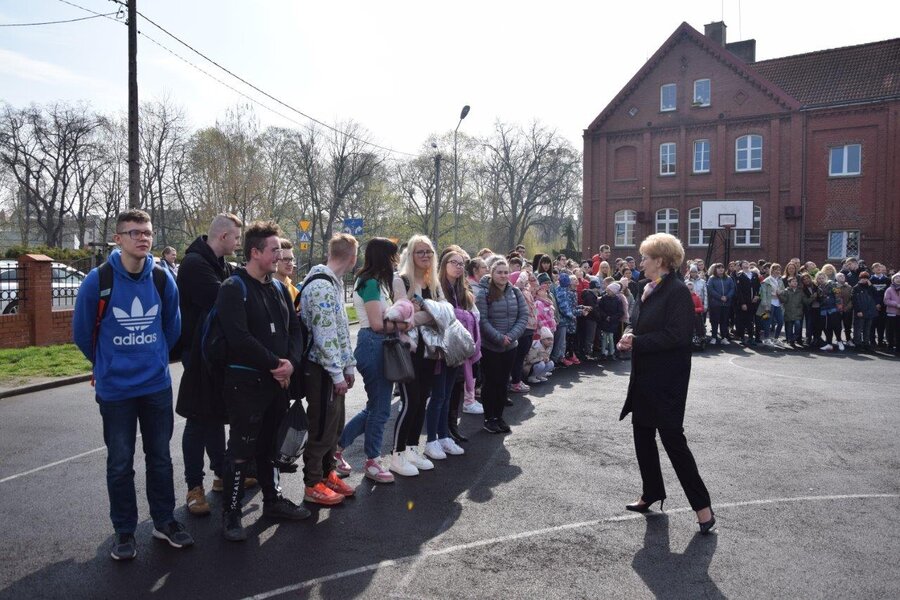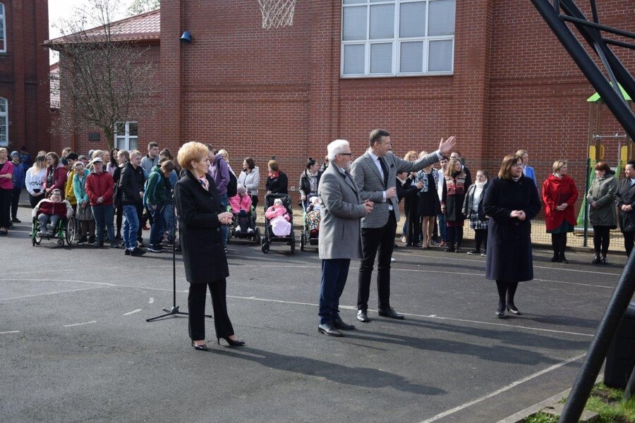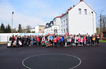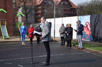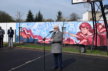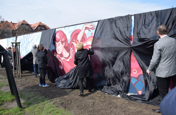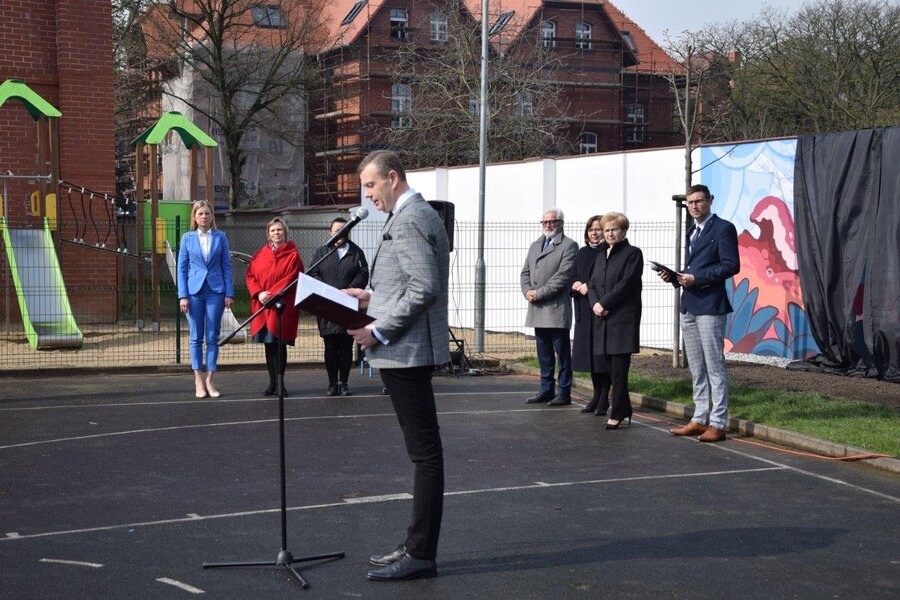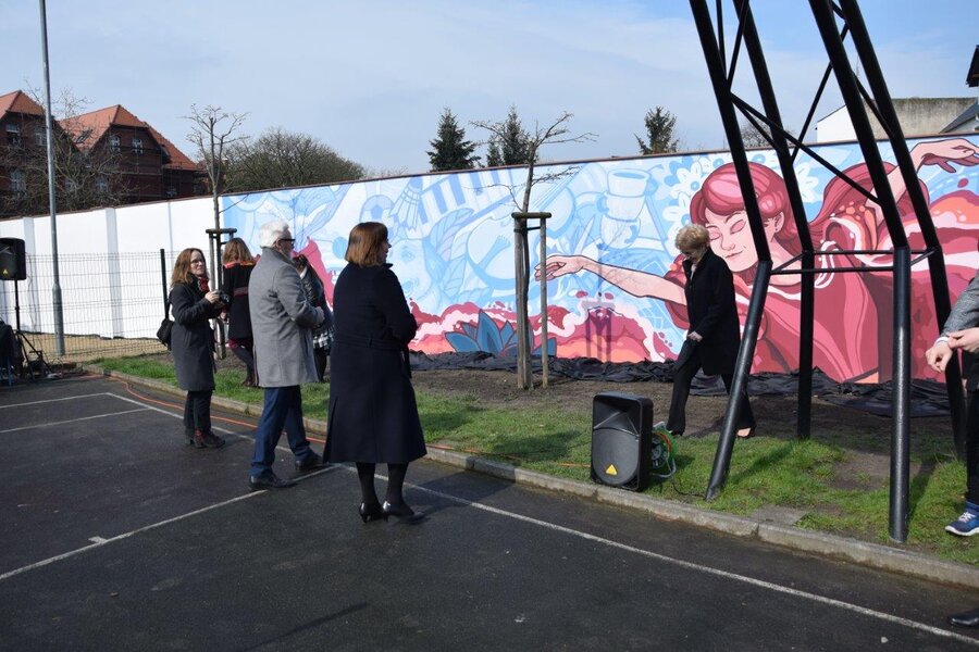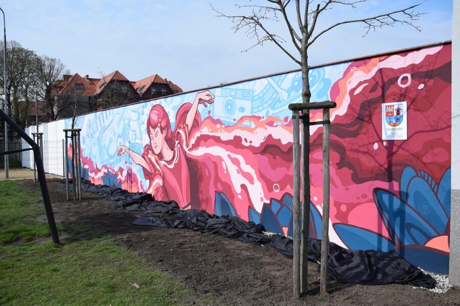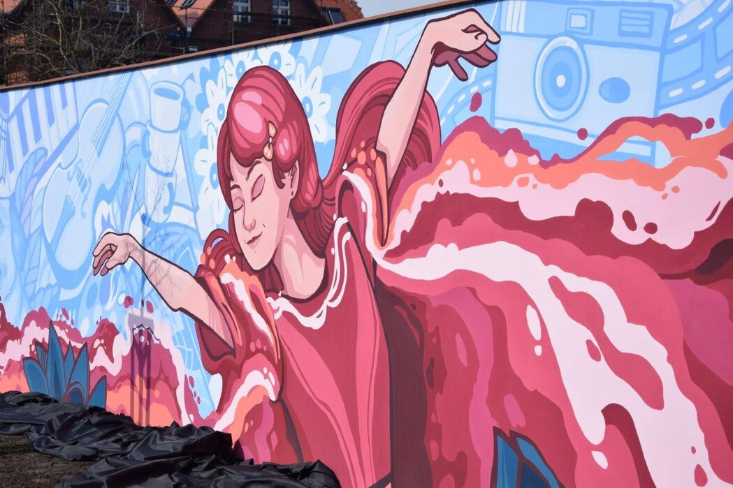 Na boisku Zespołu szkół im. Marii Konopnickiej w Kościanie odsłonięto mural przedstawiający tancerkę otoczoną przedmiotami kojarzącymi się z kościańską placówką.