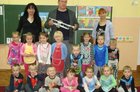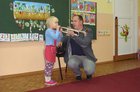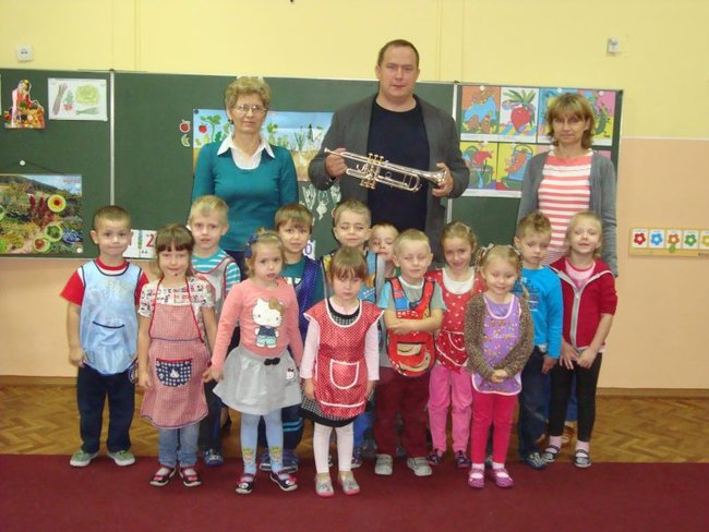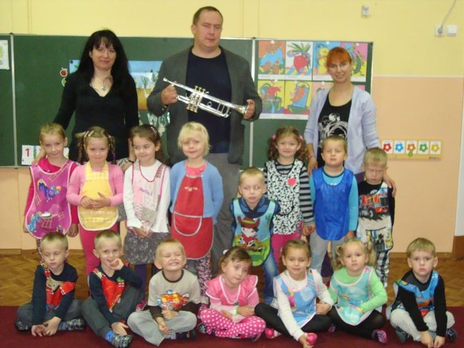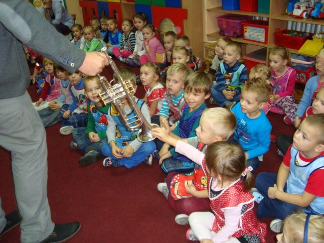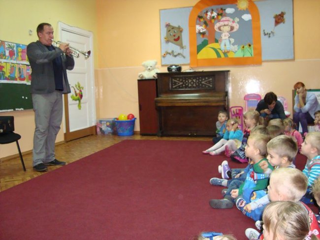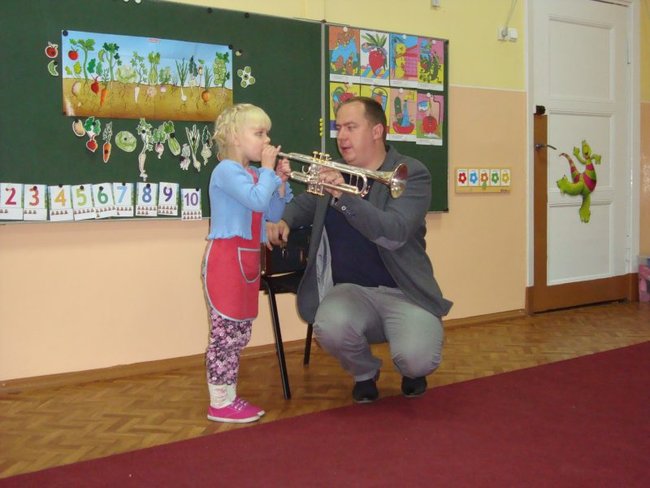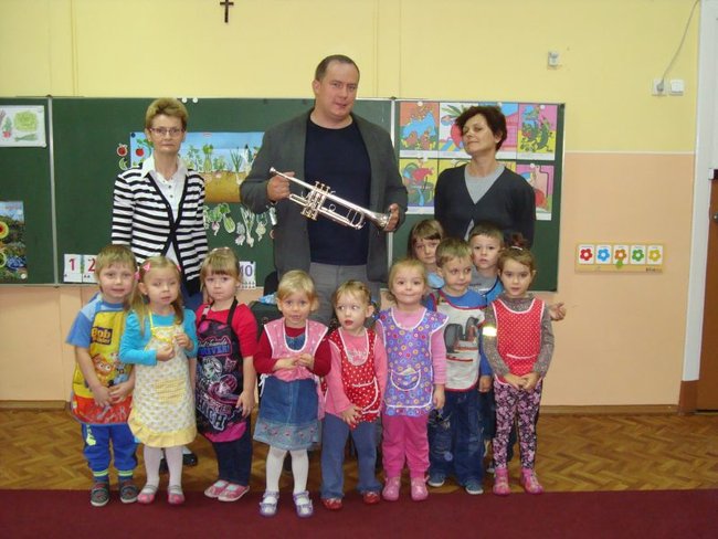 Dzieci spotkały się z kapelmistrzem miejscowej Młodzieżowej Orkiestry Dętej Piotrem Błaszkowskim. Pan Piotr ciekawie opowiadał o początkach muzycznej przygody z trąbką. Dzieci poznały historię, budowę oraz brzmienie instrumentu. W skupieniu słuchały pięknie granych utworów. Chętne przedszkolaki miały możliwość zagrania na trąbce, ale nie było to takie proste. Na zakończenie spotkania większość dzieci zadeklarowało, że w przyszłości zasilą szeregi orkiestry.
