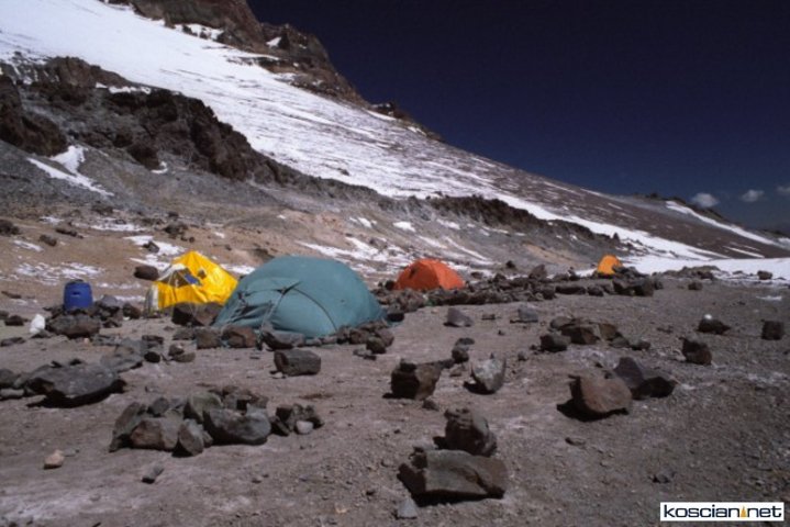 Następnego popołudnia, po bardzo długim śnie, likwidujemy obóz i schodzimy w dół. Wykańczająca wspinaczka poprzedniego dnia powoduje, że Paweł zostaje na nocleg w obozie Nido de Condores, a ja gnam co sił do Plaza de Mulas, aby zdążyć przed zmrokiem. Drugi raz w ciągu dwóch dni w egipskich ciemnościach dochodzę do upragnionej bazy. Z trafieniem jednak tym razem nie ma problemu, gdyż oświetlonych kilkadziesiąt namiotów jest niczym latarnia dla marynarza.