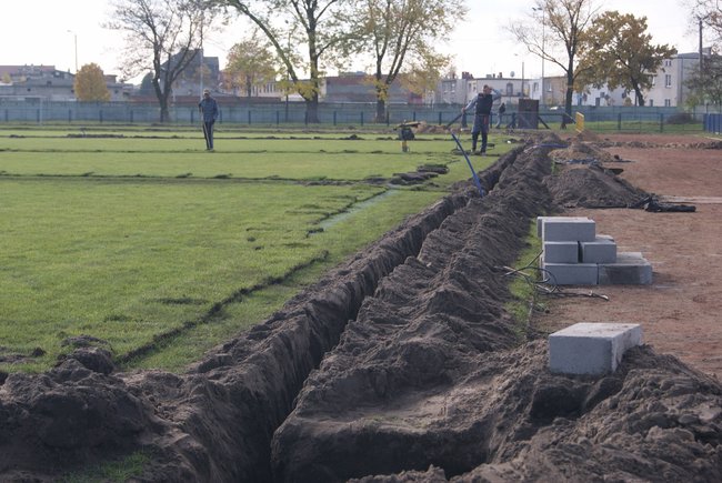 Jak po inwazji kretów wyglądała na początku listopada murawa kościańskiego Stadionu Miejskiego im. H. Tomkiewicza. Wykopy w boisku związane były z instalacją systemu automatycznego nawadniania trawy