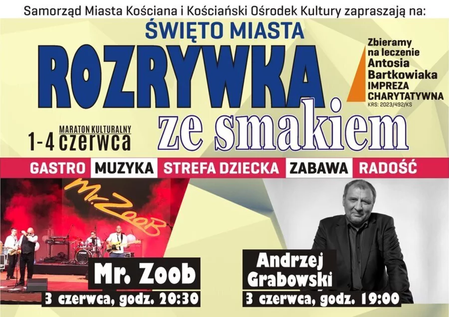 Przez całe ”Święto Miasta Rozrywka ze smakiem” prowadzona będzie zbiórka na rzecz Antosia Bartkowiaka, chorego na mastocytozę, nr zbiórki KRS: 2023/492/KS.