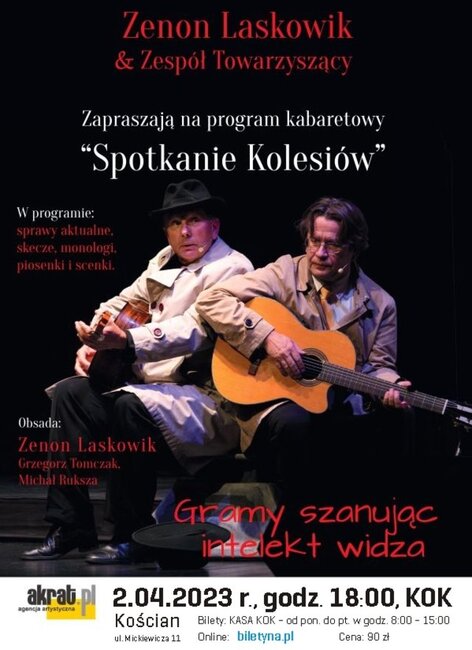 - W niedzielę w KOK wystąpi Zenon Laskowik w programie „Spotkanie kolesiów”. W programie sprawy aktualne, skecze, monologi, piosenki i scenki. Występują: Zenon Laskowik, Jacek Fedorowicz, Krzysztof Jaślar, Ada Biernacka i zespół muzyczny Promile. Gramy szanując intelekt widza! – zapewniają artyści.