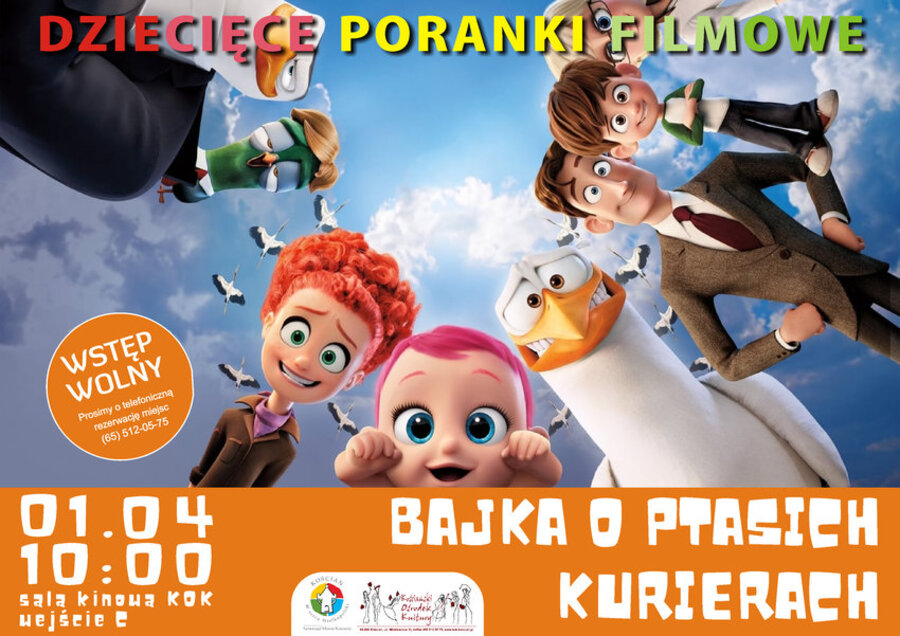 - W sobotę KOK zaprasza na kolejny seans w ramach Dziecięcych Poranków Filmowych. Na dużym ekranie obejrzeć będzie można „Bajkę o ptasich kurierach”, która opowie o bocianach, które niegdyś przynosiły dzieci. Jednak ptaki zmieniły profesję i teraz pracują dla wielkiej firmy internetowej. Jeden z najlepszych kurierów przypadkiem aktywuje maszynę, dzięki której na świat przychodzi urocza dziewczynka. Musi wziąć sprawy w swoje ręce i znaleźć maluchowi nowy dom…