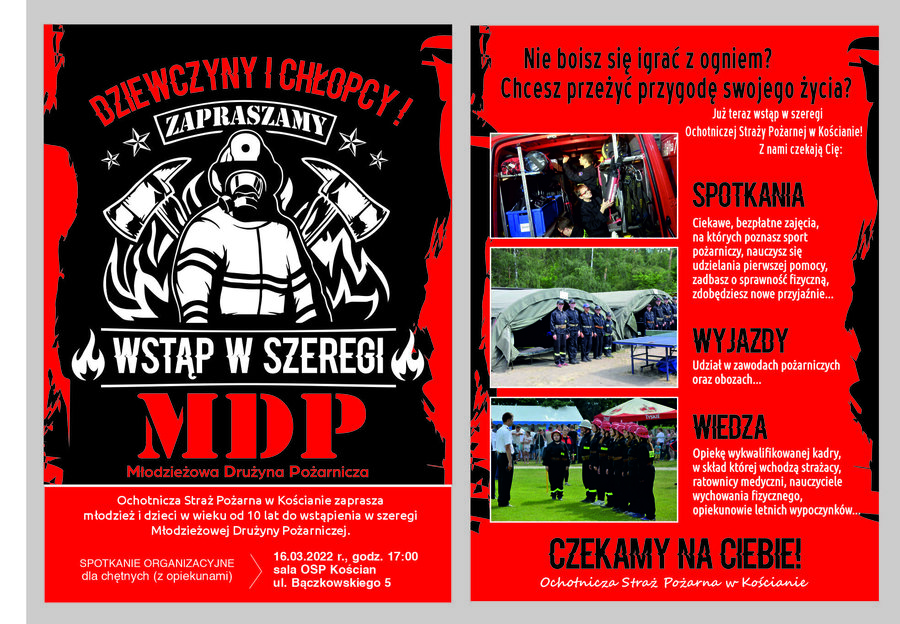 - Oprócz ciekawych szkoleń, spotkań z profesjonalnymi strażakami i obozów strażackich, jako zawodnicy Młodzieżowych Drużyn Pożarniczych (dziewczęcych i chłopięcych) będziecie reprezentowali kościańską jednostkę w zawodach pożarniczych na szczeblach krajowych oraz - w przypadku dobrych wyników - w międzynarodowych Olimpiadach Pożarniczych – zachęcają strażacy. - Wszystkich chętnych wraz z rodzicami zapraszamy na spotkanie organizacyjne, które odbędzie się w środę, 16 marca, o godz. 17.00 do sali OSP Kościan przy ul. Bączkowskiego 5.